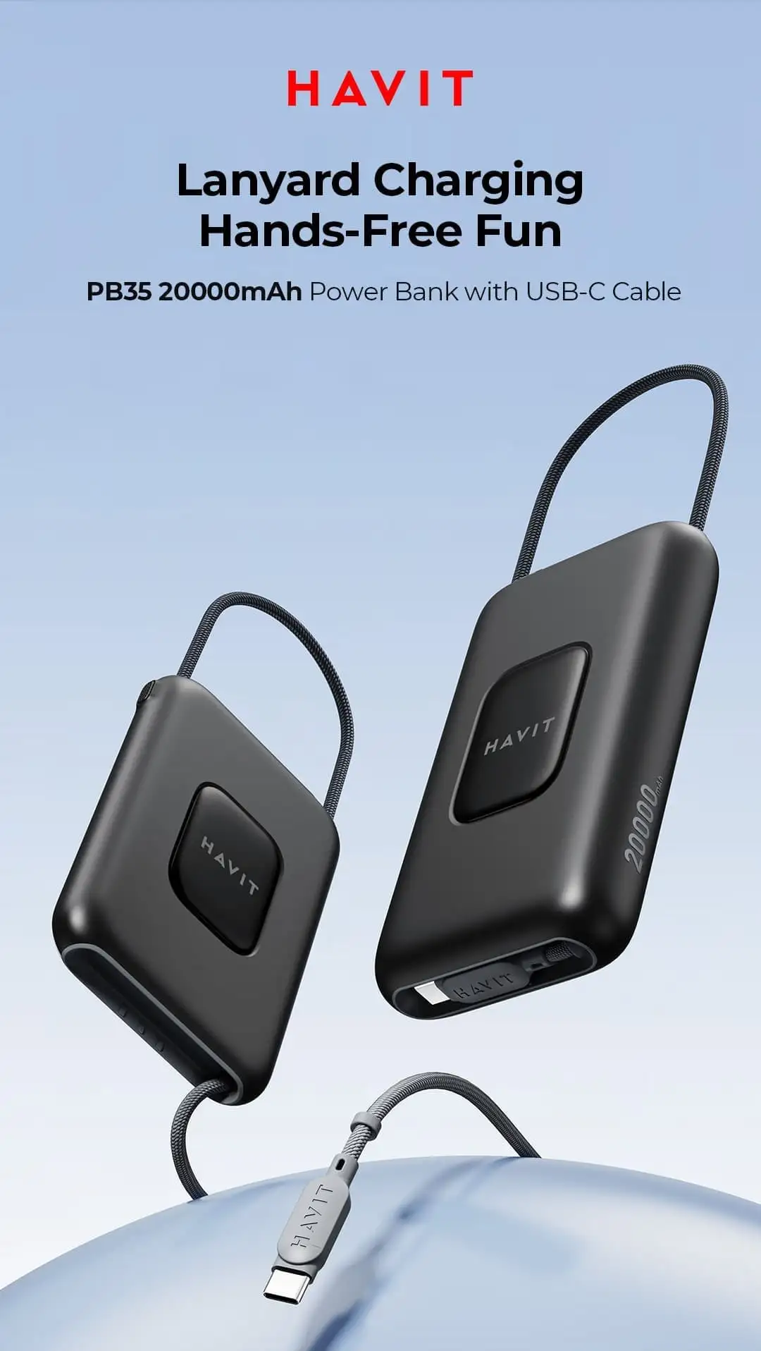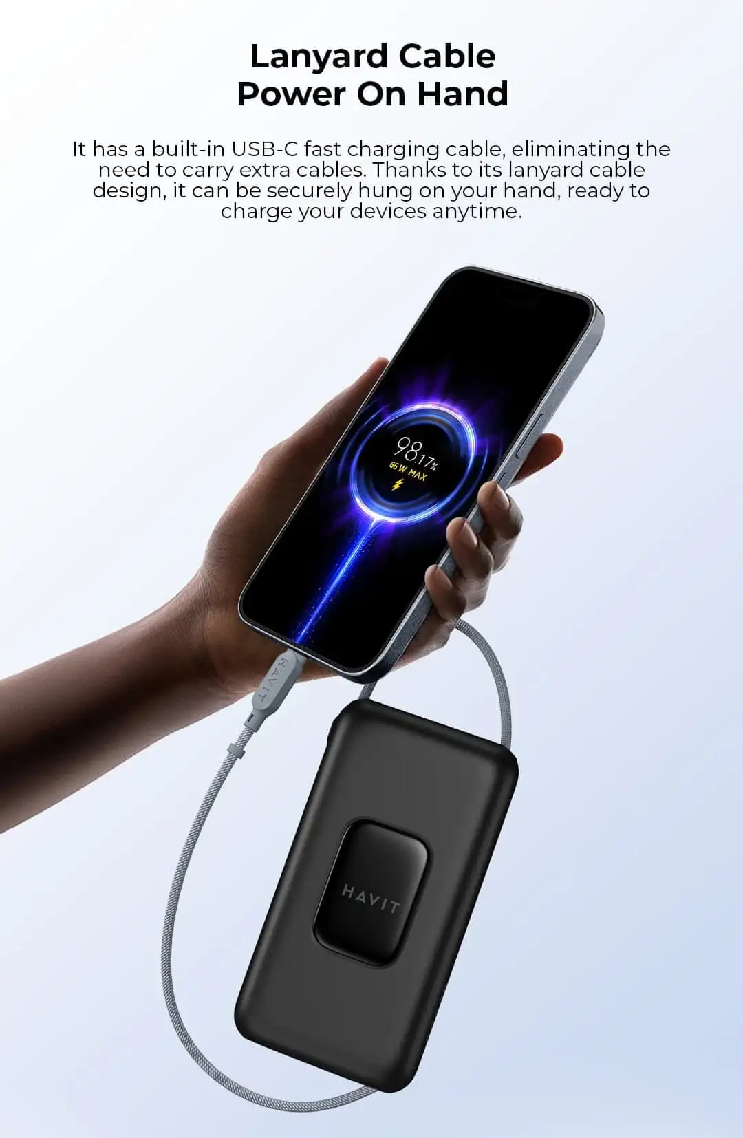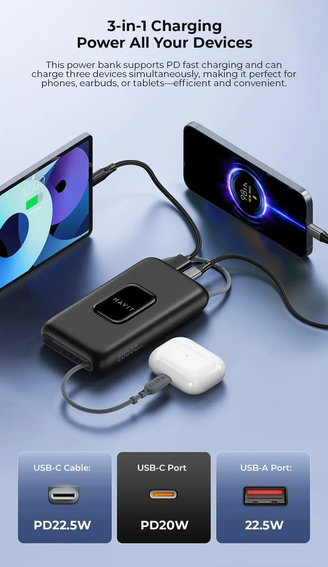 20000mAh 22.5W power bank. USB-C cable / port input. USB-C cable / port, USB-A port output. LED digital display. Support most fast charge protocol