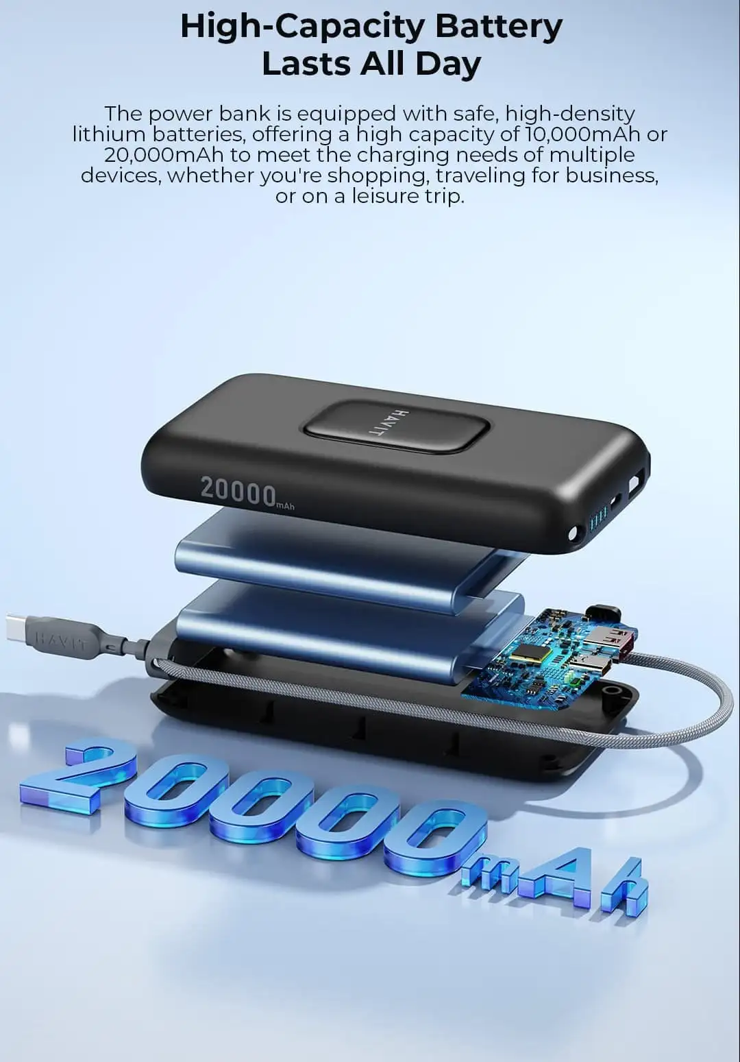 20000mAh PD65W power bank. USB-C cable / port input. USB-C cable / port, USB-A port output. LED digital display of battery charge level. Pass-through charging